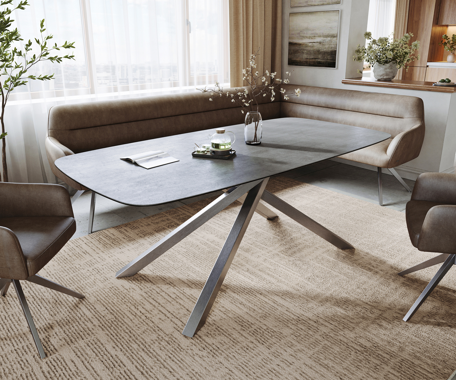 Svým charakteristickým liniovým vedením a drsnou krásou betonového vzhledu vytváří deska stolu Boulevard výrazný designový prvek. Strukturovaná keramika v chladné šedé jí dodává moderní a sebevědomou přítomnost – ideální pro milovníky městské bytové estetiky. V kombinaci s výrazným Edge designem vzniká stůl, který spojuje individualitu, dynamiku a designovou odbornost.