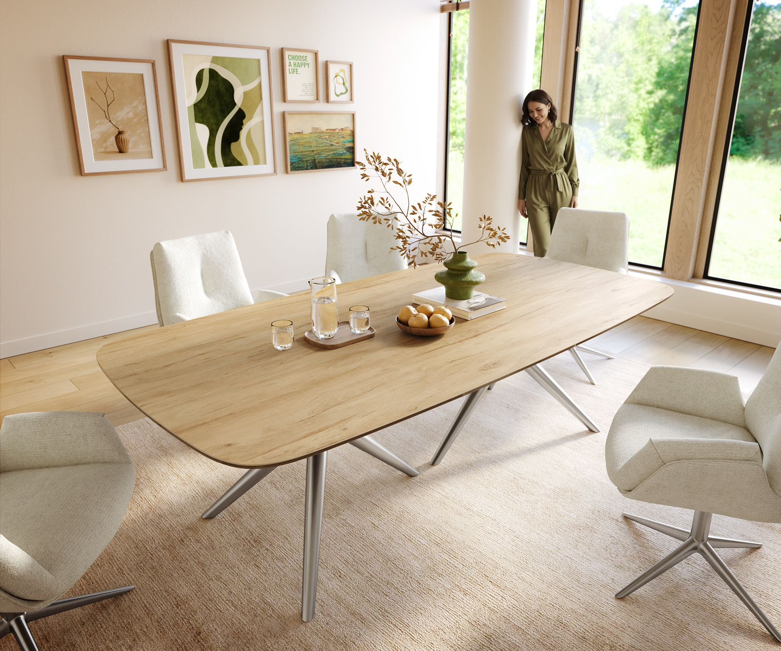 Podnož zaujme svým propracovaným a přitom lehkým vzhledem. Přitahuje pozornost k elegantní desce stolu a zdůrazňuje tak její jedinečný charakter. Podnož je vyrobena z kvalitní nerezové oceli. Stříbrný lesk tohoto zvláště odolného materiálu proti poškrábání a nárazům dodá tvému jídelnímu prostoru elegantní a nadčasovou atmosféru.