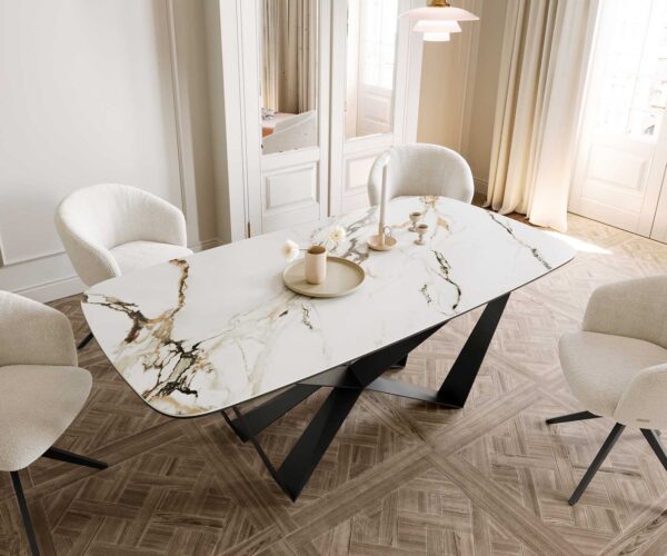 Ohromující jídelní stůl Edge z keramiky Calacatta Luxe v oválném tvaru