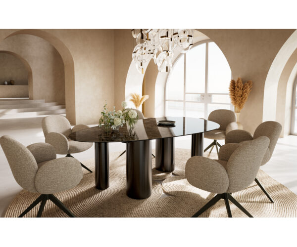 V matné černé barvě zdůrazňuje výjimečná podnož z nerezové oceli krásu desky stolu a díky čtyřem nohám ve dvou různých průměrech vytváří pestrou hru stability a zdánlivého pohybu.