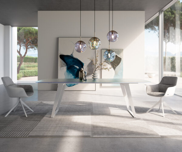 Šikmá tenká podnož z práškově lakovaného kovu v nadčasové bílé barvě rozjasní tvůj stůl Edge a přívětivě zvýrazní jedinečné charakteristiky desky stolu.