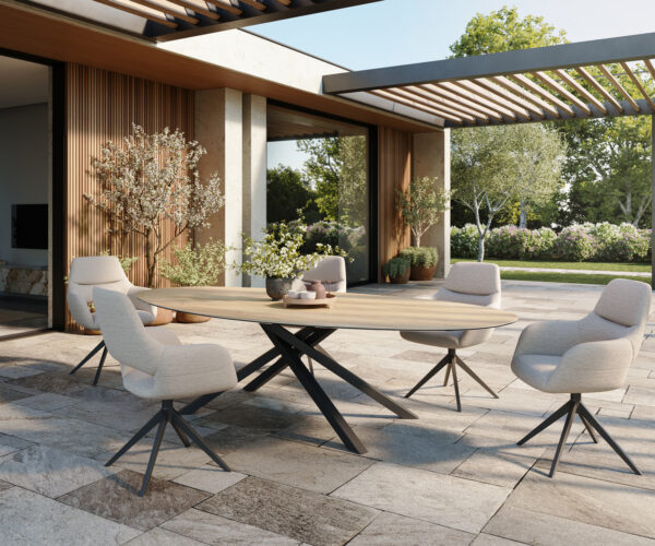 • Oválná deska stolu zdůrazňuje krásu keramiky Laminam®
