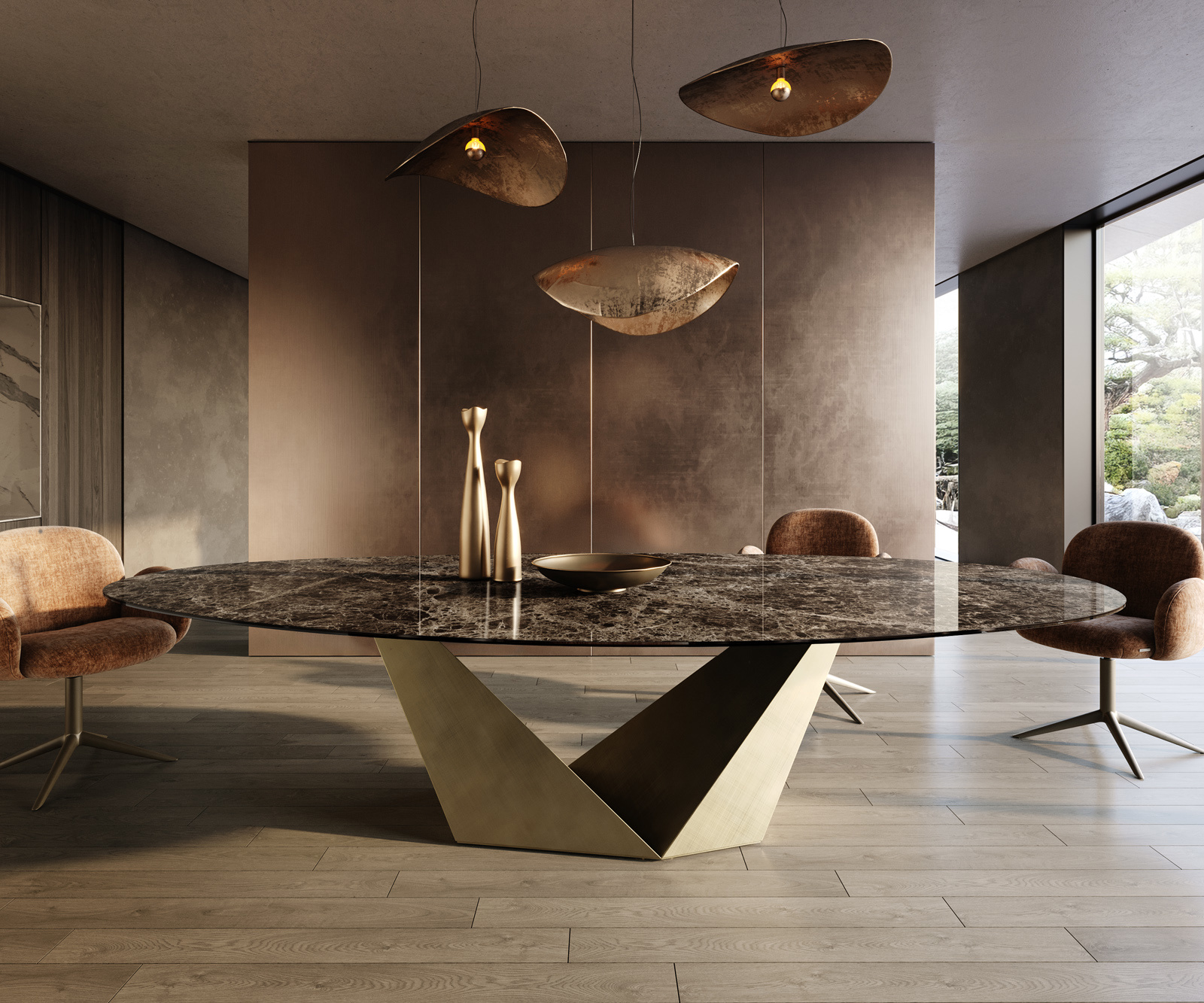 Jídelní stůl Edge oválný 315×150 cm keramika Emperador Extra Lucidato tmavě hnědá Prisma Metallic Gold