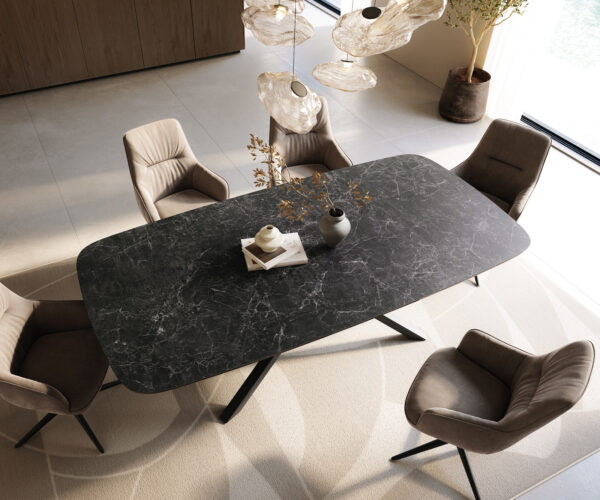 Deska tohoto stolu Edge je vyrobena z pravé keramiky Laminam® a náročně tvarována do bohatého oválného tvaru. Kromě své výjimečné optiky a exkluzivního designu vyniká stůl Edge především svými dobrými vlastnostmi pro snadnou údržbu a dlouhou životností. Exkluzivní odstín Nero Greco antracit a materiál připomínají hodnotný tmavý mramor. Lehce strukturovaný povrch zajišťuje jedinečný hmatový zážitek.