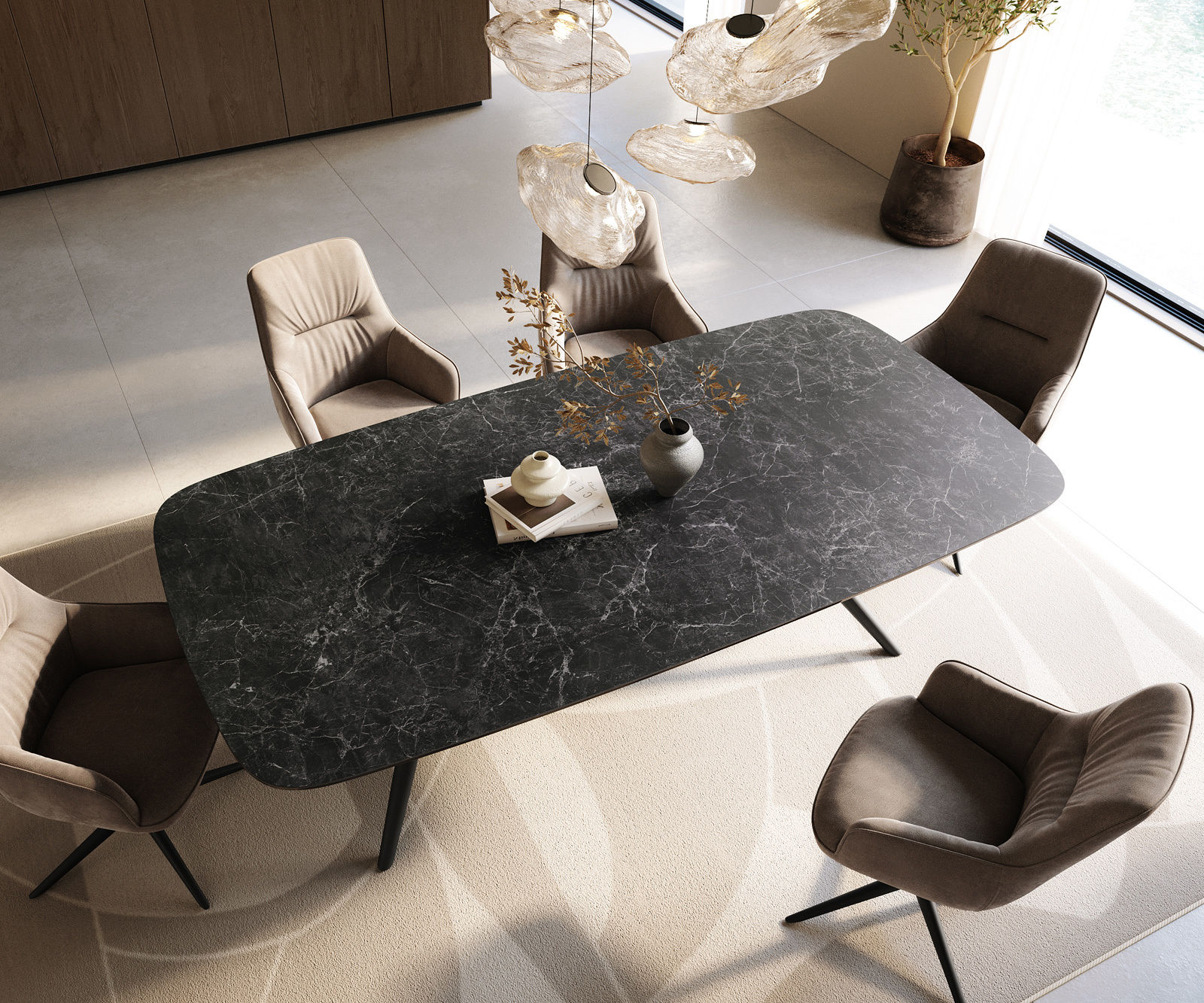 Deska tohoto stolu Edge je vyrobena z pravé keramiky Laminam® a pečlivě tvarována do bohatého oválného tvaru. Kromě svého výjimečného vzhledu a exkluzivního designu vyniká stůl Edge především svými snadnými údržbovými vlastnostmi a dlouhou životností. Exkluzivní odstín Nero Greco antracit a materiál připomínají hodnotný, tmavý mramor. Lehce strukturovaný povrch zajišťuje jedinečný hmatový zážitek.