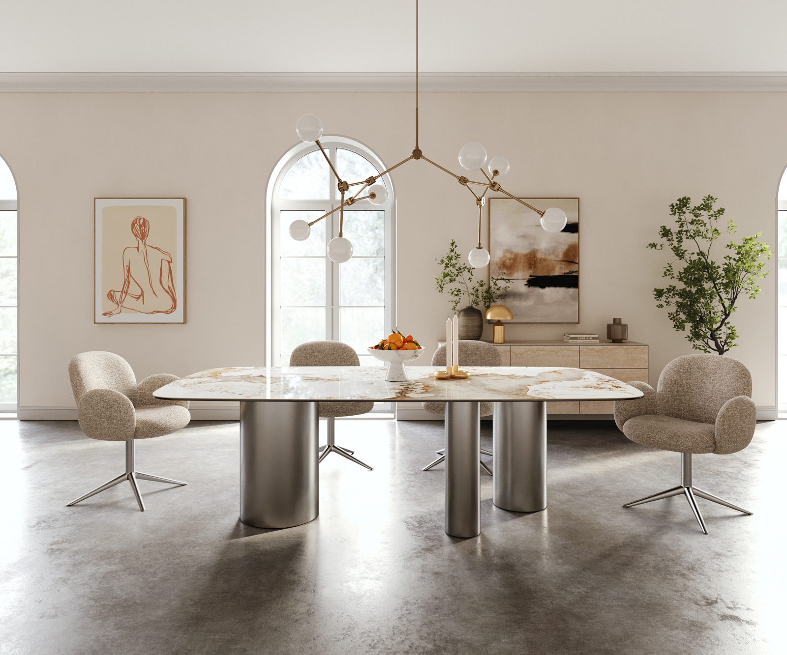 Jídelní stůl Edge tvar oválný 240×120 cm keramika Minas Melange bílá béžová Troa nerezová ocel kartáčovaná
