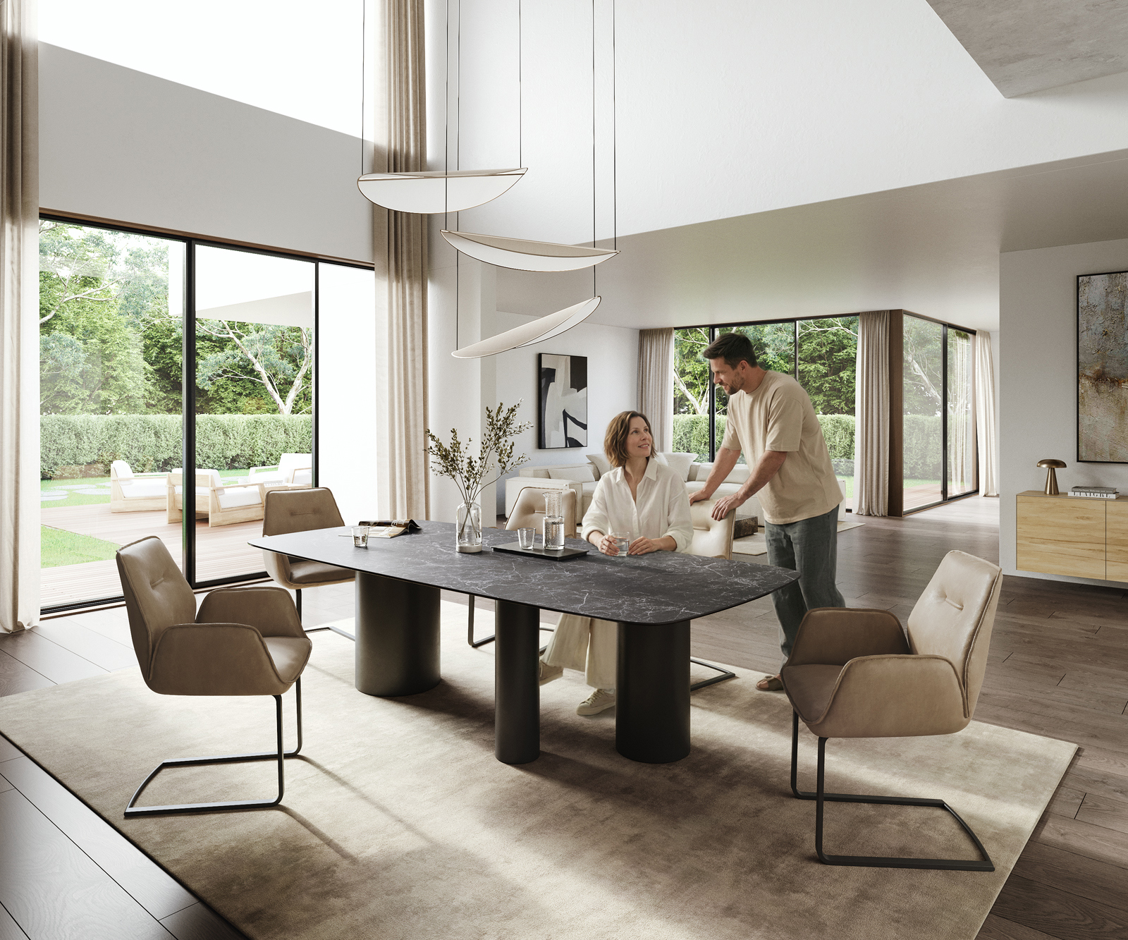 Deska tohoto stolu Edge je vyrobena z pravé keramické Laminam® desky a náročně tvarována do bohatého oválného tvaru. Kromě svého výjimečného vzhledu a exkluzivního designu vyniká stůl Edge především svými snadnými vlastnostmi údržby a dlouhou životností. Exkluzivní odstín Nero Greco antracit a materiál připomínají hodnotný tmavý mramor. Lehce strukturovaný povrch zajišťuje jedinečný hmatový zážitek.
