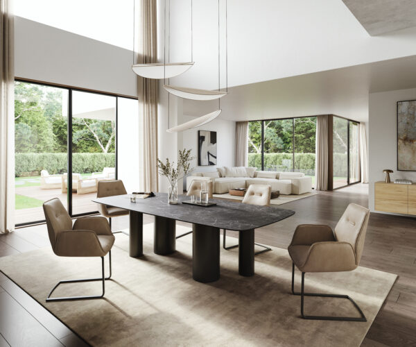 Deska tohoto stolu Edge je vyrobena z pravé keramické Laminam® desky a pečlivě tvarována do bohatého oválného tvaru. Kromě své výjimečné optiky a exkluzivního designu vyniká stůl Edge především svými dobrými vlastnostmi pro údržbu a dlouhou životností. Exkluzivní odstín Nero Greco antracit a materiál připomínají vzácný, tmavý mramor. Lehce strukturovaný povrch zajišťuje jedinečný hmatový zážitek.