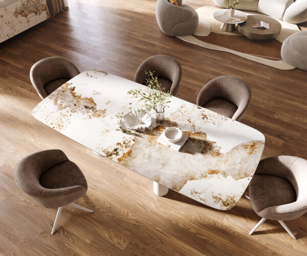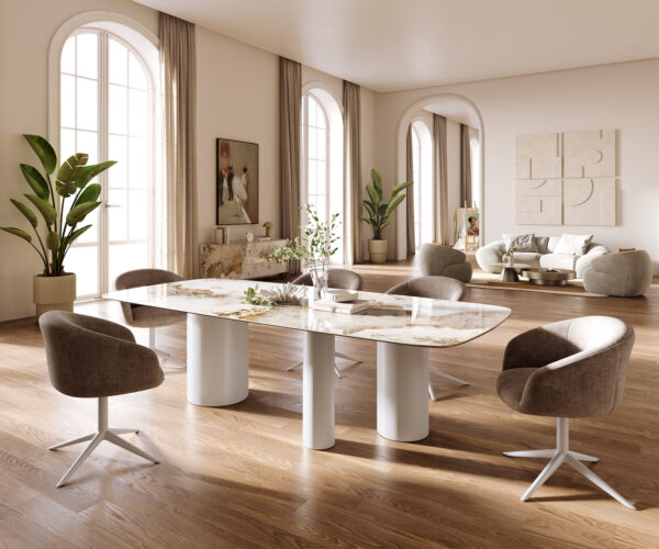 • Deska stolu je vyrobena z jednoho celistvého keramického plátu a získává tak svou jedinečnost v harmonickém celkovém vzhledu.