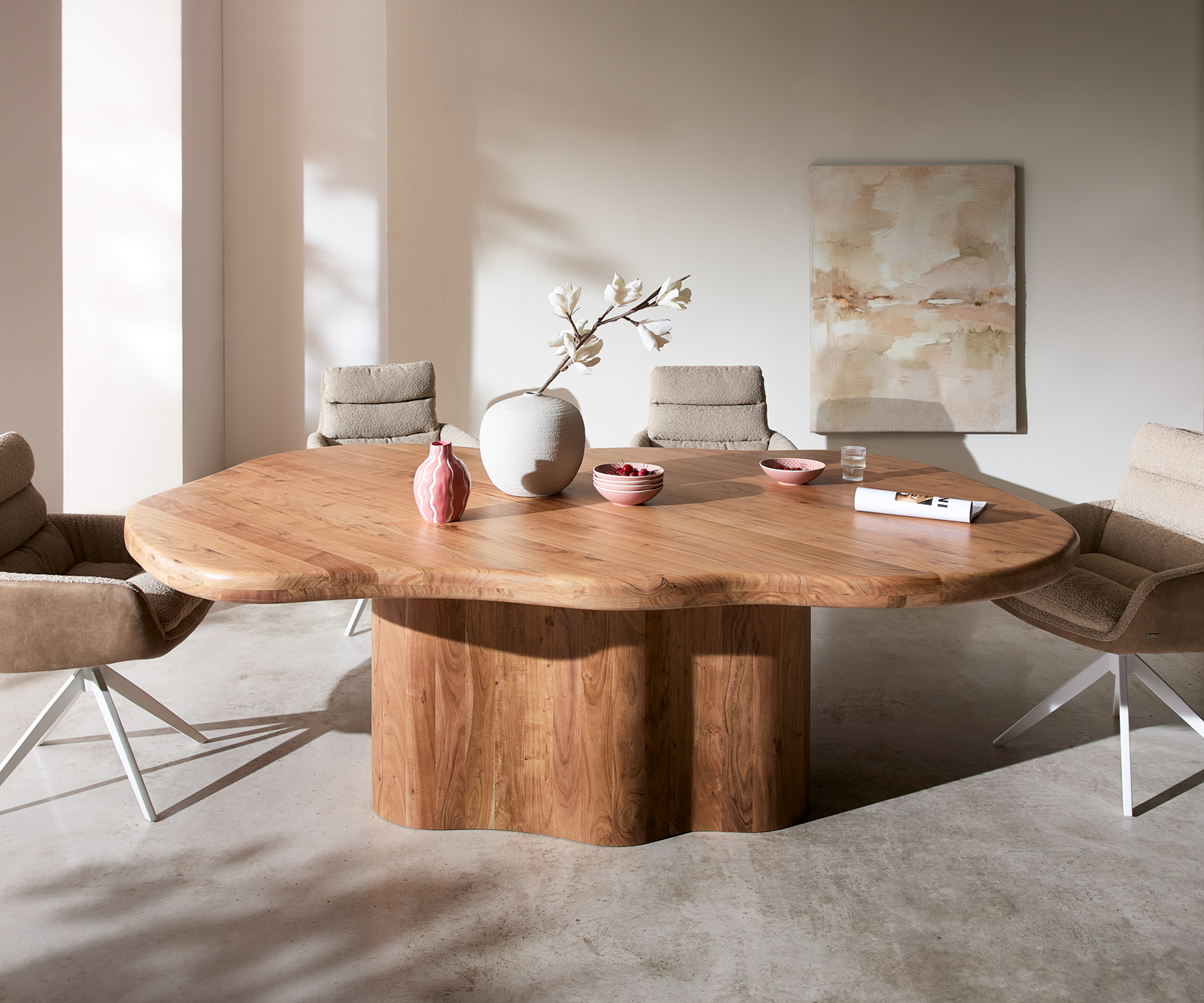 Ať už dlouhé večery s přáteli nebo každodenní rodinný život – Herkon nabízí prostor pro setkávání. Zdvojená deska stolu dodává stolu impozantní stabilitu, zatímco organicky tvarované nohy z masivního akáciového dřeva zajišťují pevný stojan. Lakovaný povrch spolehlivě chrání dřevo a usnadňuje údržbu v běžném provozu. Ideální pro otevřené obytné koncepty, velké jídelní prostory a lidi, kteří si cení poctivých materiálů a výrazného designu.