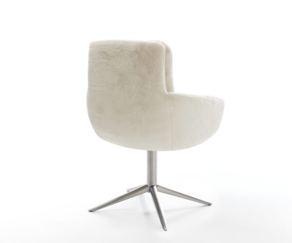 Ušlechtilý plyšový potah v jemné krémově bílé barvě dodává židli zvlášť elegantní charisma. Měkký povrch nabízí nejvyšší komfort sezení – ideální pro moderní jídelní a obytné prostory s kvalitním vybavením.