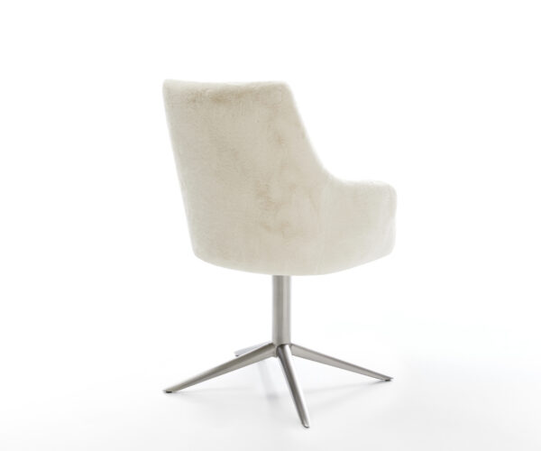 Ušlechtilý plyšový potah v jemné krémově bílé barvě dává židli obzvlášť elegantní vzhled. Měkký povrch nabízí nejvyšší pohodlí při sezení – ideální pro moderní jídelní a obytné prostory s kvalitním vybavením.