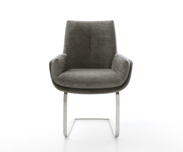 Tato židle zaujme kvalitním potahem z bouclé soft v teplém tmavě béžovém odstínu (schlamm). Jemná struktura a klidná barva dodávají nábytku moderní, útulné charisma – ideální do jídelny nebo čtecího koutu.