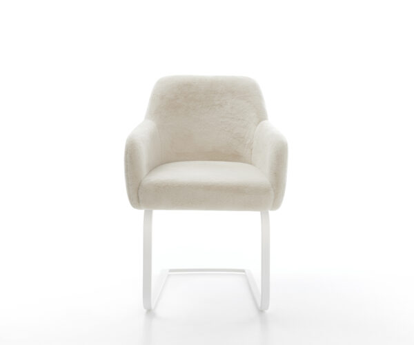 Ušlechtilý plyšový potah v jemné krémově bílé barvě dodává židli zvlášť elegantní charisma. Měkký povrch nabízí nejvyšší komfort sezení – ideální pro moderní jídelní a obytné prostory s kvalitním vybavením.