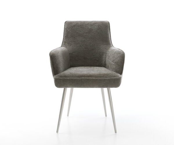 Tato židle zaujme kvalitním potahem z bouclé soft v teplém tmavě béžovém odstínu. Jemná struktura a klidná barva dodávají nábytku moderní a útulné charisma – ideální pro jídelní kout nebo čtecí koutek.