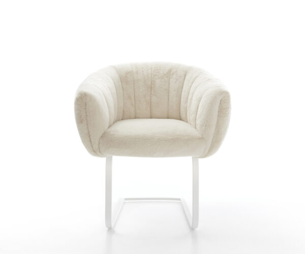Ušlechtilý plyšový potah v jemné krémově bílé barvě propůjčuje židli obzvlášť elegantní charisma. Měkký povrch nabízí nejvyšší komfort sezení – ideální pro moderní jídelní a obytné prostory s kvalitním vybavením.