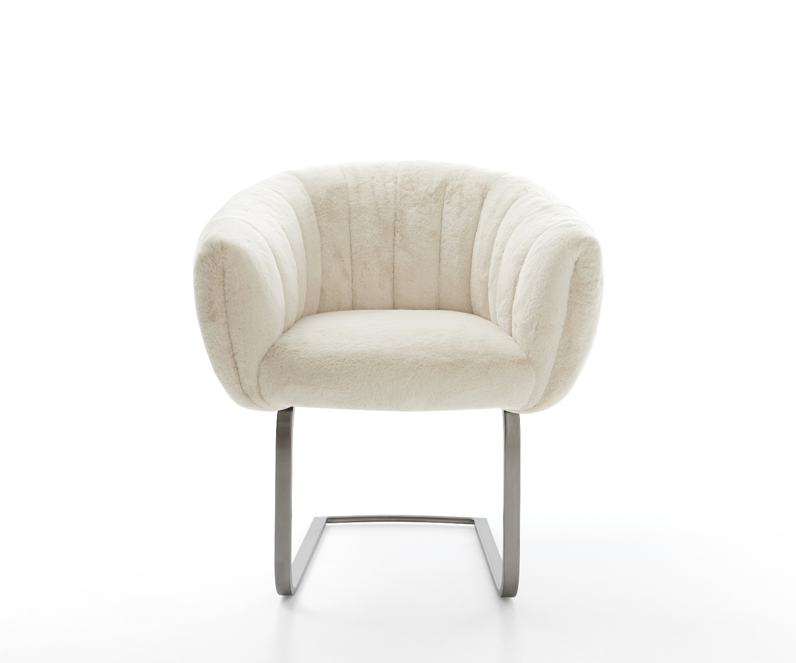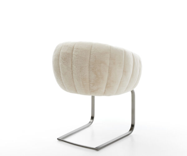 Ušlechtilý plyšový potah v jemné krémově bílé barvě dodává židli obzvlášť elegantní charisma. Měkký povrch nabízí nejvyšší komfort sezení – ideální pro moderní jídelní a obytné prostory s kvalitním vybavením.