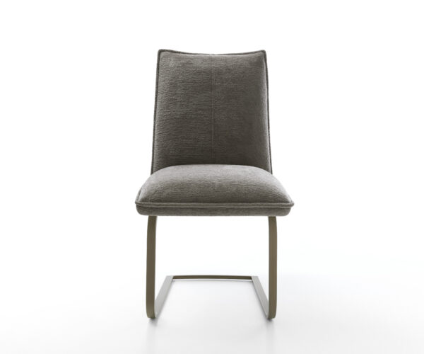 Tato jídelní židle zaujme kvalitním potahem z bouclé soft v teplém tmavě béžovém odstínu (schlamm). Jemná struktura a klidná barva dodávají nábytku moderní, útulné charisma – ideální do jídelny nebo čtecího koutku.