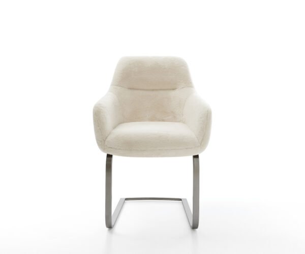 Ušlechtilý plyšový potah v jemné krémově bílé barvě dodává židli obzvlášť elegantní charisma. Měkký povrch nabízí maximální pohodlí při sezení – ideální pro moderní jídelny a obývací prostory s kvalitním vybavením.