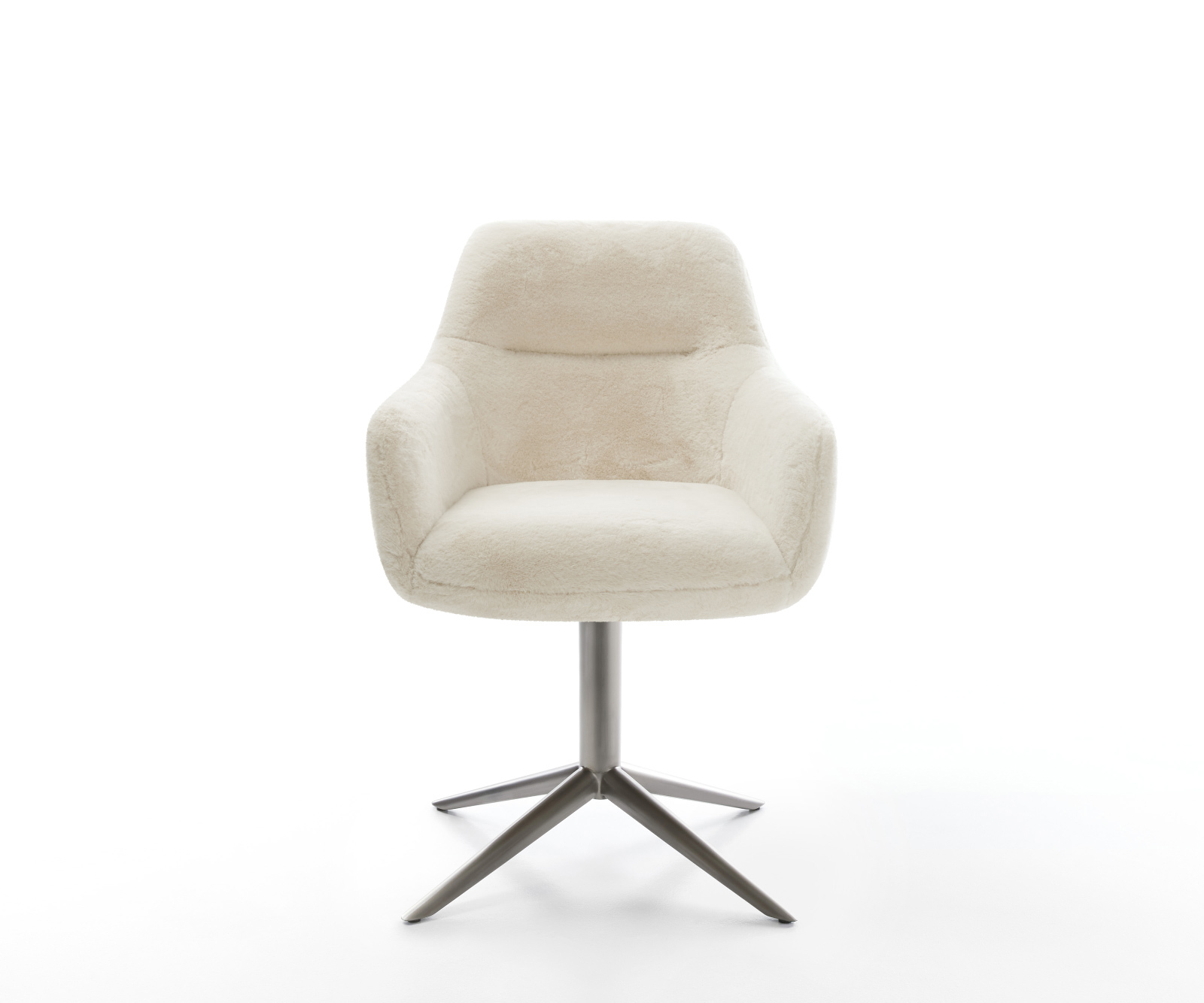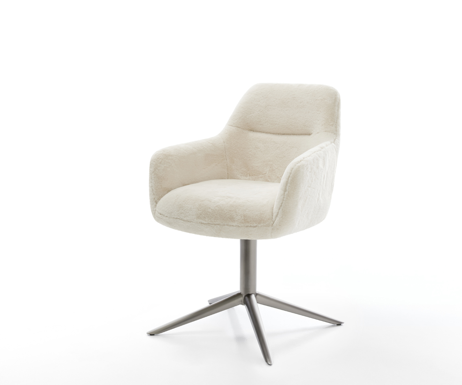 Ušlechtilý plyšový potah v jemné krémově bílé barvě dodává židli zvlášť elegantní charisma. Měkký povrch nabízí nejvyšší komfort sezení – ideální pro moderní jídelní a obývací prostory s kvalitním vybavením.
