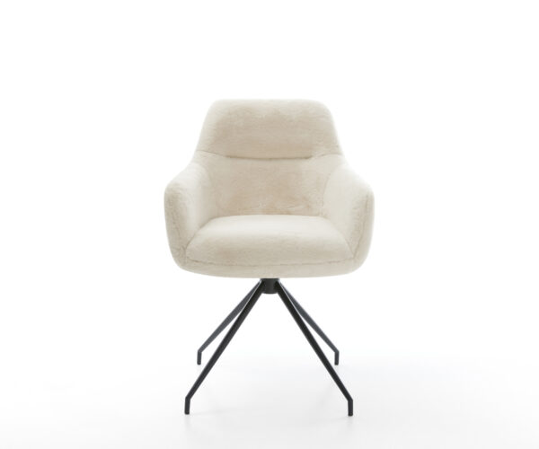 Ušlechtilý plyšový potah v jemné krémově bílé barvě dodává židli obzvlášť elegantní charisma. Měkký povrch nabízí nejvyšší pohodlí při sezení – ideální pro moderní jídelní a obytné prostory s kvalitním vybavením.