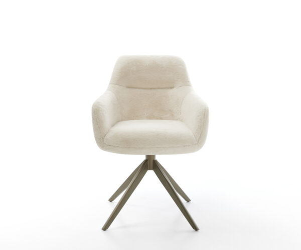 Ušlechtilý plyšový potah v jemné krémově bílé barvě dodává židli zvlášť elegantní charisma. Měkký povrch nabízí nejvyšší komfort sezení – ideální pro moderní jídelní a obytné prostory s kvalitním vybavením.