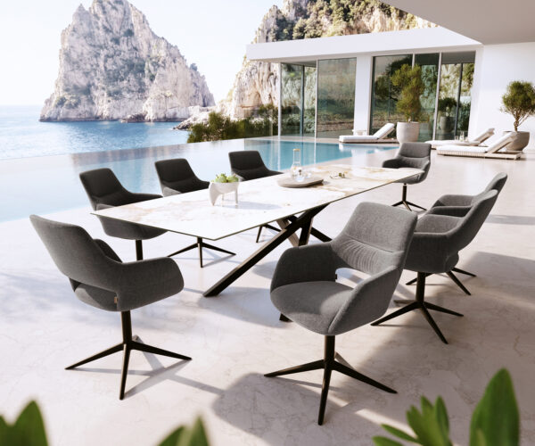 Yago-Flex přináší pocit domova z interiéru ven. S proříznutým opěradlem, jemně se zužujícími područkami a jemným ozdobným švem působí lehce, elegantně a nádherně útulně. Vodopropustná komfortní pěna podporuje použití venku a činí z něj stylovou volbu pro terasu, balkon i interiér. Tak vzniká jídelní židle pro venkovní použití, která v každém prostředí působí mimořádně harmonicky.