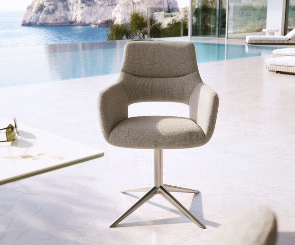 Jídelní židle Yago-Flex s područkami strukturovaná látka šedo-bílá křížová podnož nerezová ocel 360° otočný houpací funkce