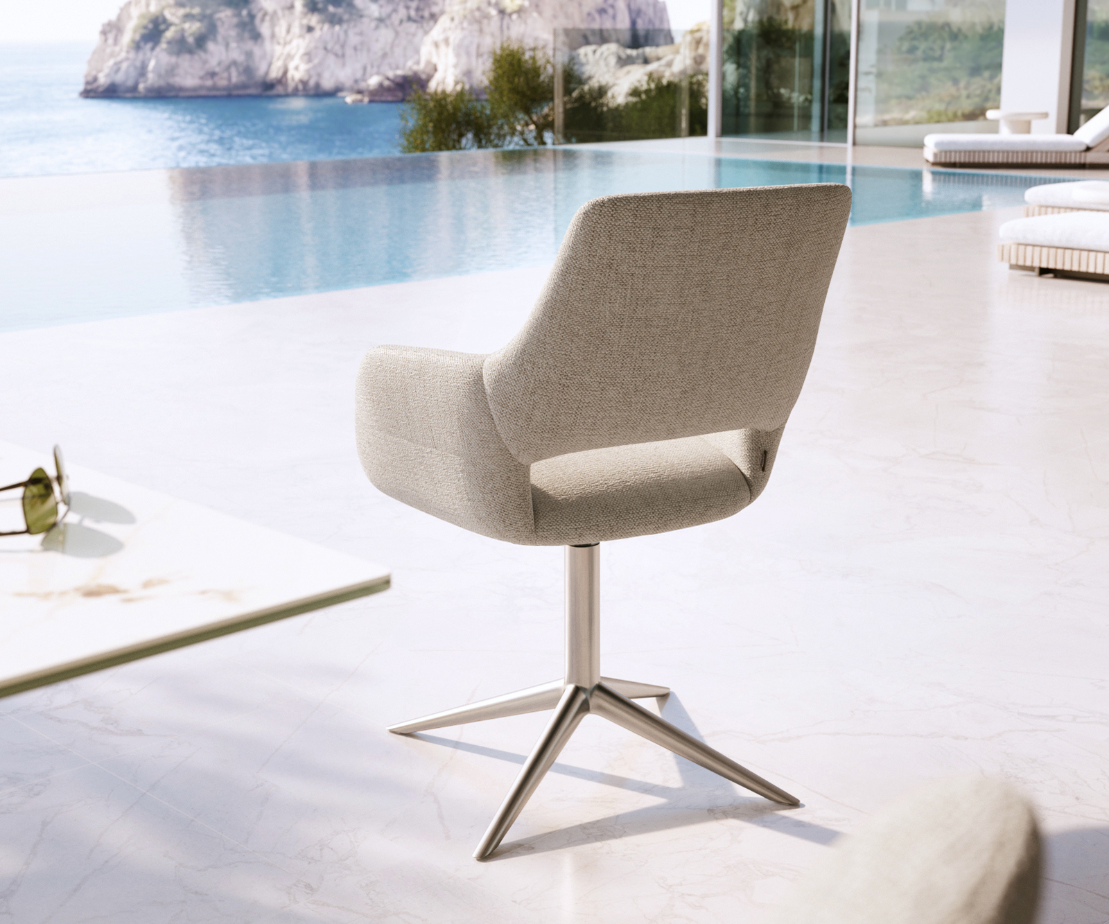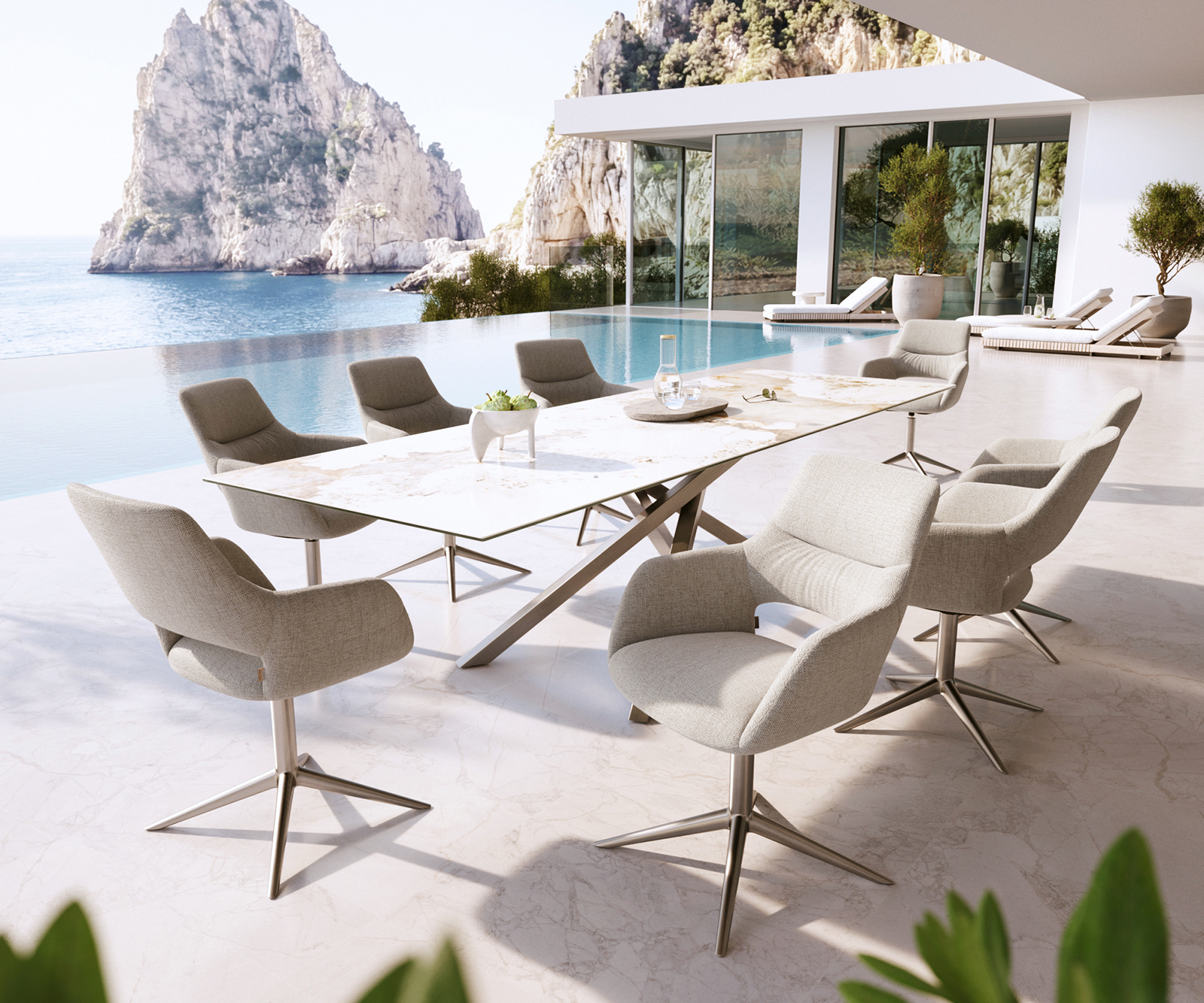 Yago-Flex přináší pocit domova z interiéru ven. S prořízlým opěradlem, jemně se zužujícími područkami a jemným ozdobným švem působí lehce, elegantně a nádherně útulně. Vodopropustná komfortní pěna podporuje použití venku a činí z něj stylovou volbu na terasu, balkon i do interiéru. Tak vzniká jídelní židle pro venkovní použití, která v každém prostředí působí výjimečně harmonicky.