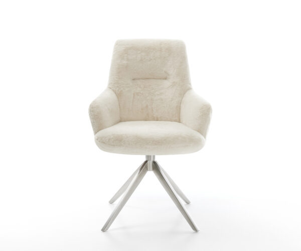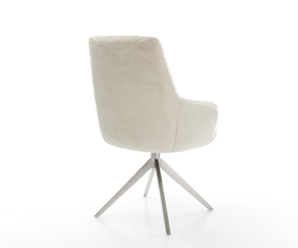 Ušlechtilý plyšový potah v jemné krémově bílé barvě dodává židli obzvlášť elegantní charisma. Měkký povrch nabízí nejvyšší pohodlí při sezení – ideální pro moderní jídelní a obytné prostory s kvalitním vybavením.