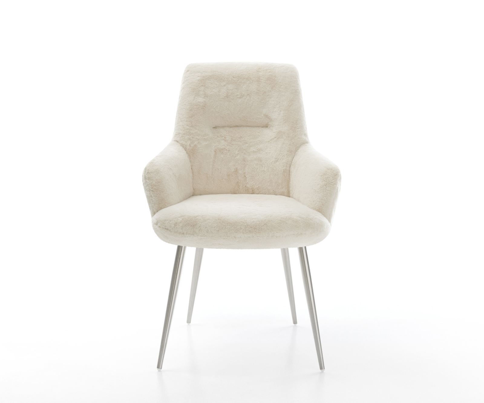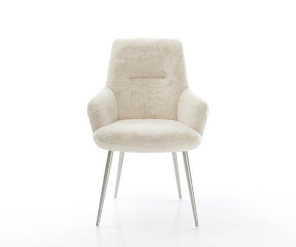 Ušlechtilý plyšový potah v jemné krémově bílé barvě dodává židli obzvlášť elegantní charisma. Měkký povrch nabízí nejvyšší pohodlí při sezení – ideální pro moderní jídelní a obývací prostory s kvalitním vybavením.