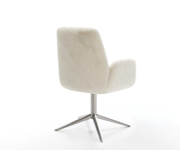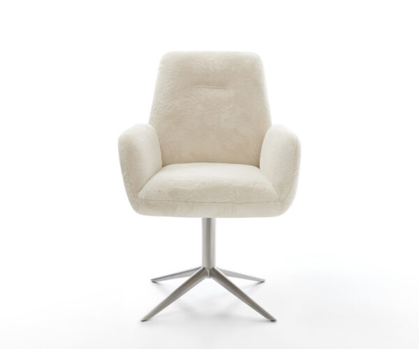 Ušlechtilý plyšový potah v jemné krémově bílé barvě dodává židli obzvlášť elegantní charisma. Měkký povrch nabízí nejvyšší pohodlí při sezení – ideální pro moderní jídelní a obytné prostory s kvalitním vybavením.
