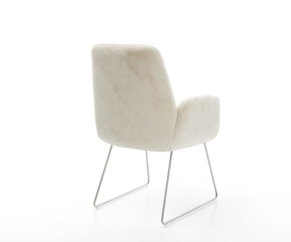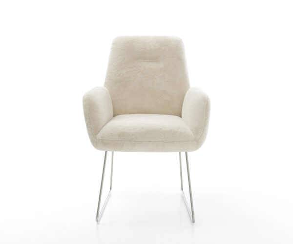Luxusní plyšový potah v jemné krémově bílé barvě dodává židli zvlášť elegantní charisma. Měkký dotek nabízí nejvyšší pohodlí při sezení – ideální pro moderní jídelní a obytné prostory s kvalitním vybavením.