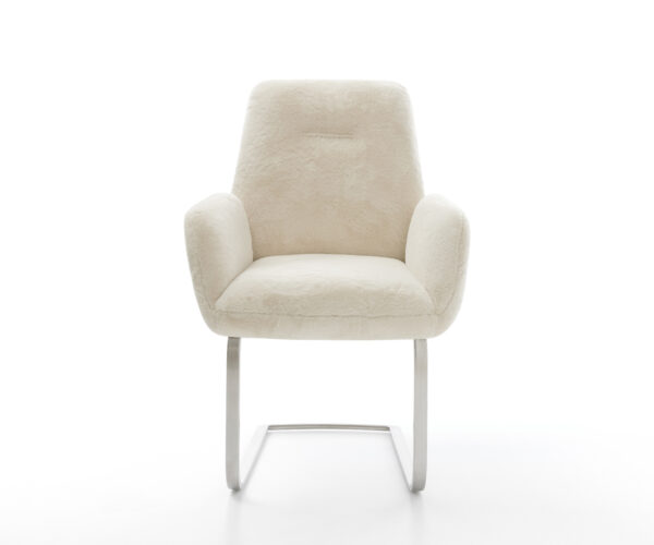 Ušlechtilý plyšový potah v jemné krémově bílé barvě dodává židli zvlášť elegantní charisma. Měkký povrch nabízí nejvyšší pohodlí při sezení – ideální pro moderní jídelní a obytné prostory s kvalitním vybavením.