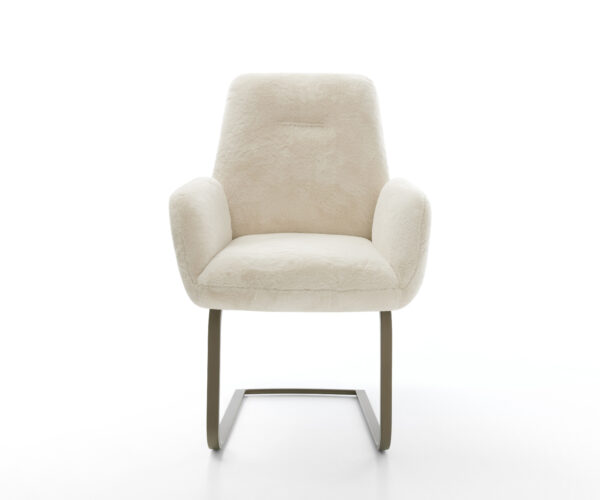 Ušlechtilý plyšový potah v jemné krémově bílé barvě dodává židli zvlášť elegantní charisma. Měkký povrch nabízí nejvyšší pohodlí při sezení – ideální pro moderní jídelní a obytné prostory s kvalitním vybavením.