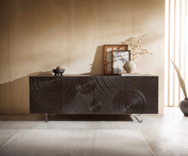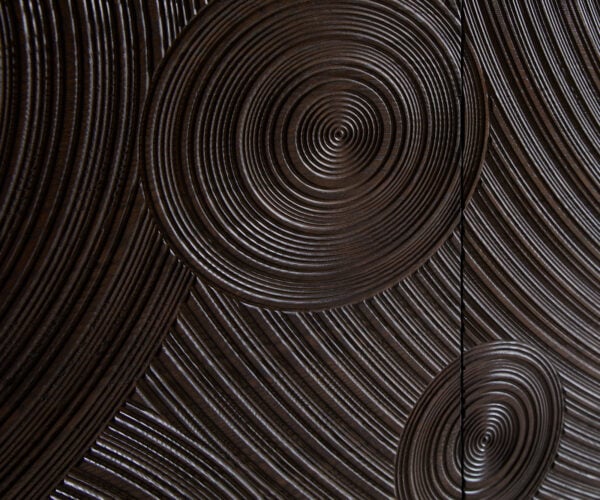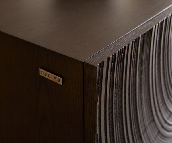 Komoda Ashara v elegantní tmavě hnědé barvě z jasanového dřeva vytváří svými uměleckými, kulatými 3D frézováními výjimečný akcent ve vašem obývacím prostoru. Čtyři dvířka nabízejí prostorný úložný prostor, který je díky kvalitnímu kování ovladatelný jemně a pohodlně.