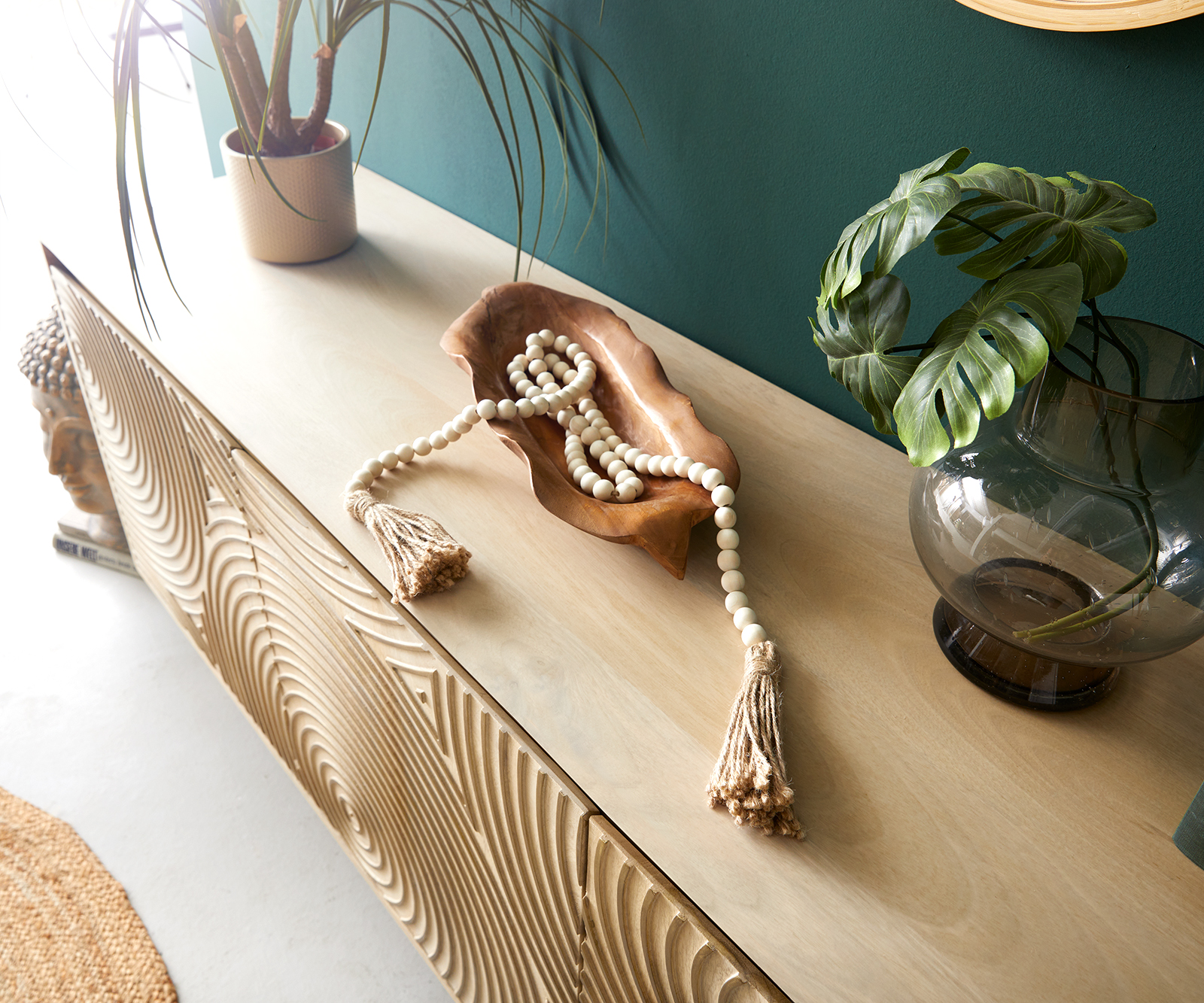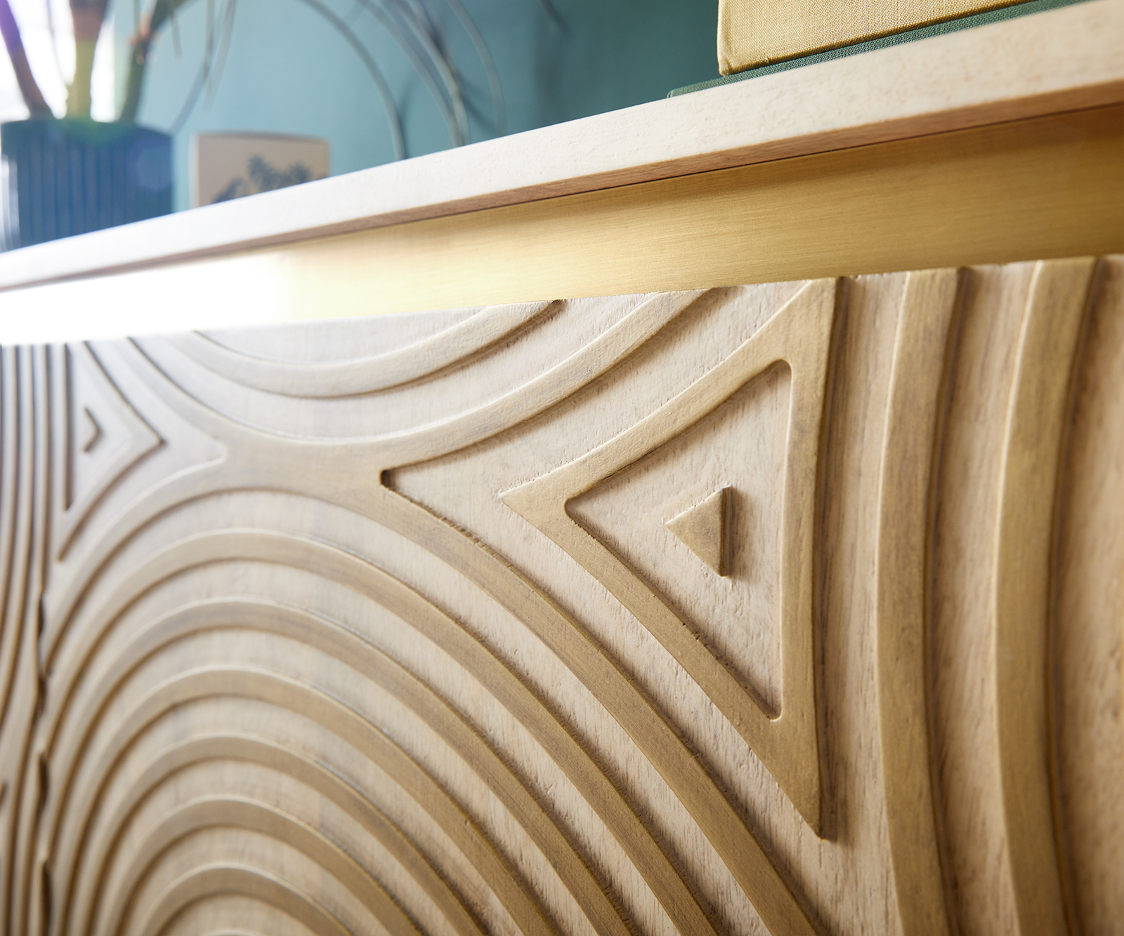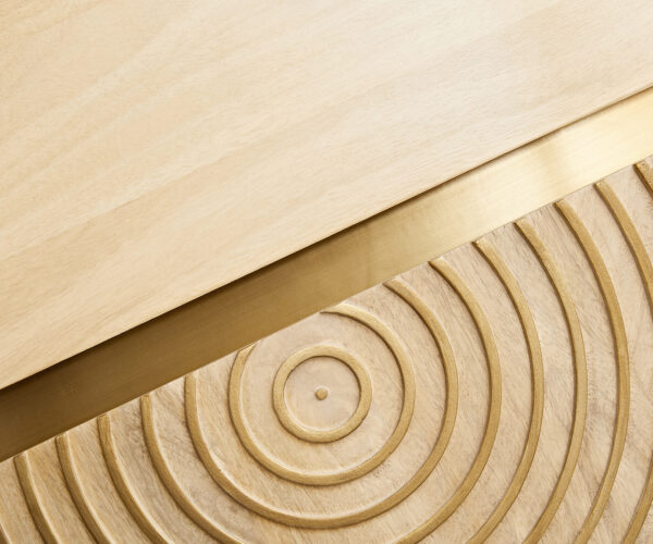 Detailní komoda pro obývací nebo jídelní prostory. Výjimečně krásné mosazné přední části zdobí komodu vzorem v etno stylu. Září v přirozeně světle středně hnědé barvě manga s jemnými šedozelenými odstíny.