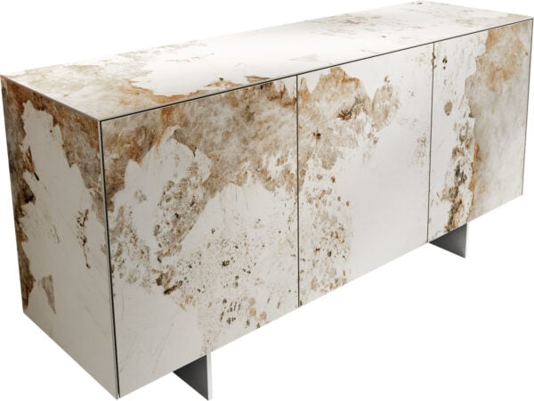 Vysoce kvalitní hightech keramika obaluje komodu CUOR do jemné kompozice z jemných bílých a béžových tónů. Jemné kresby dřeva a elegantní barevné přechody vytvářejí hloubku a pohyb. Živá, harmonická a nadčasově krásná tato jedinečná směs barev a tvarů doplňuje a završuje ikonický design CUOR v mistrovské dokonalosti. Jemné nohy z černého práškově lakovaného kovu upoutávají pozornost na design nábytku, dodávají mu pevný stojan a propůjčují mu lehký, zdánlivě bezváhový vzhled.