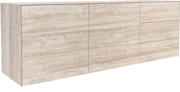 Pravá italská Laminam® keramika, známá svou estetickou rafinovaností a vynikající kvalitou, nechává komodu CUOR zářit v teplých odstínech připomínajících cenné dubové dřevo. Inspirována jemnou hrou barev benátské laguny vzniká kompozice hloubky, struktury a přirozeného klidu – zasazená do designu, který ikonicky spojuje nadčasovou eleganci a výraznou přítomnost. Pro ještě působivější efekt je nábytek pevně připevněn přímo na zeď pomocí stabilního držáku. Závěsný vzhled dodává lehkost a zvlášť harmonický vzhled.