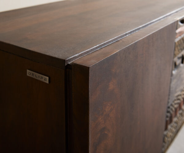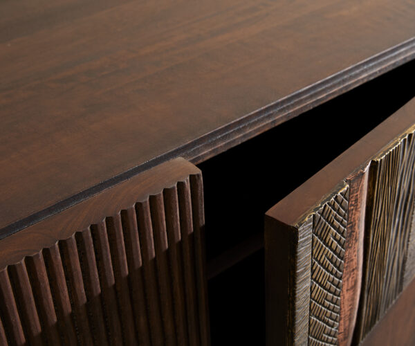 Komoda Imara spojuje umělecký design se závěsnou elegancí. Ozdobená dýhou z mangového dřeva v teplé hnědé barvě přináší útulnost, zatímco přední strany s různorodými strukturovanými vzory vytvářejí fascinující akcenty. Díky nástěnné montáži získává nábytek moderní lehkost a dodává tvému prostoru prostornost.