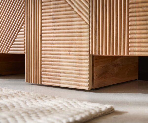 Komoda Naxxar přesvědčí nejen svým vzhledem, ale i praktičností: pět dvířek se pohodlně otevírá a zavírá a za nimi se nacházejí přihrádky s policemi, které poskytují místo pro různé každodenní věci. Díky grafickému zpracování předního panelu se komoda výrazně odlišuje od běžného nábytku a stává se dominantou každé místnosti. Robustní akácie zajišťuje dlouhou životnost a díky své živé dřevěné struktuře přináší kousek přírody do vašeho domova. S Naxxar volíte komodu, která nabízí jak stylový vzhled, tak promyšlenou funkčnost.