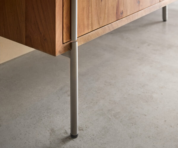 Rivoro přináší přírodní akáciové dřevo a chladné kovové akcenty do vyváženého tvaru. Lakovaný povrch zdůrazňuje individuální kresbu dřeva, zatímco štíhlé kovové nohy ve stříbrné barvě dodávají komodě moderní, téměř závěsný vzhled. Do čela integrované kovové úchyty vytvářejí jemné designové akcenty a podtrhují čisté linie.