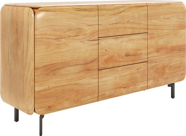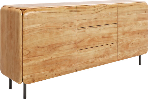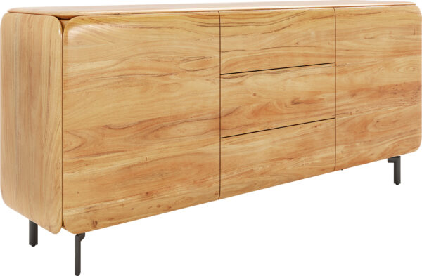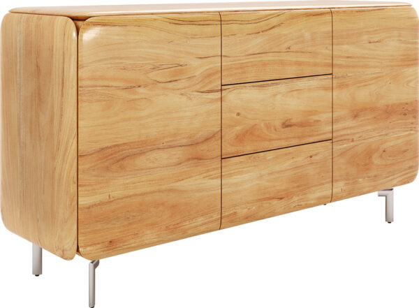 Komoda z akácie v přírodní barvě přináší do tvého domova nadčasovou eleganci. Přirozená kresba akáciového dřeva vytváří teplou a příjemnou atmosféru, zatímco všude zaoblené hrany dotvářejí design a zajišťují obzvlášť elegantní vzhled. Za dvěma dvířky a ve třech zásuvkách se skrývá spousta úložného prostoru, který ti pomůže udržet pořádek a stylově organizovat tvé prostory.