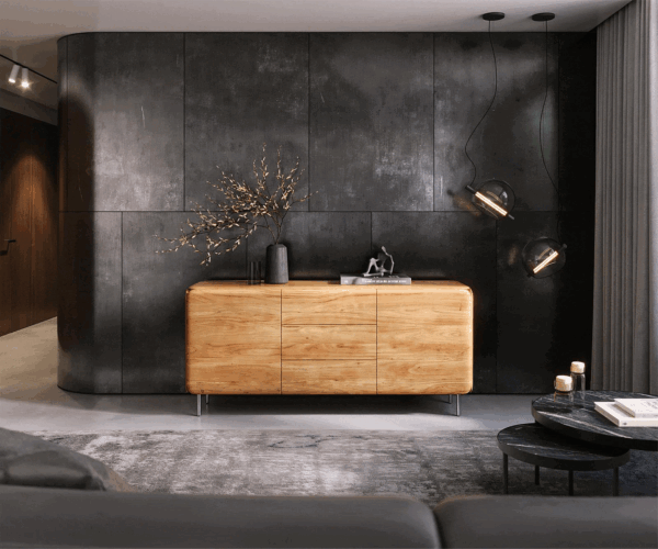 Kolekce Shavani Akazie přesvědčuje jasnými tvary a kvalitními materiály. 20 cm vysoké, kulaté nohy z nerezové oceli ve stříbrné barvě dodávají komodě moderní industriální nádech a zajišťují optimální stabilitu. Navíc poskytují dostatečnou vzdálenost od podlahy, takže prostor pod nábytkem se snadno udržuje v čistotě – ideální pro uklizený domov s stylem.