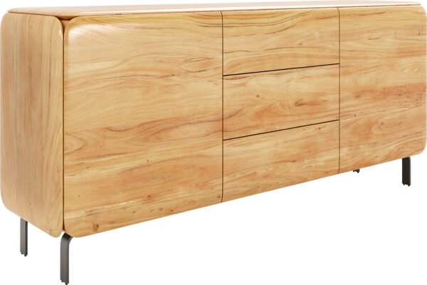 Komoda z akácie v přírodní barvě je perfektní volbou, pokud hledáte stylový úložný nábytek s jedinečným designem. Teplé, přirozené charisma akáciového dřeva skvěle ladí s moderními styly vybavení. Zvláště zaoblené hrany po celém obvodu, které jsou vyrobeny náročnou ruční prací, jsou skutečným poutačem a zdůrazňují vysokou řemeslnou hodnotu tohoto nábytku. Se dvěma dvířky a třemi zásuvkami navíc nabízí dostatek místa pro všechny vaše každodenní věci.