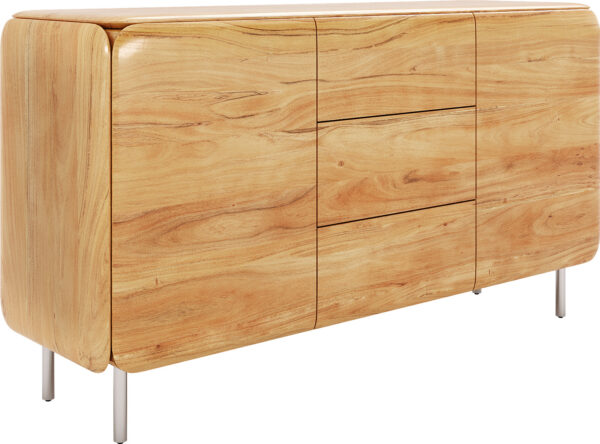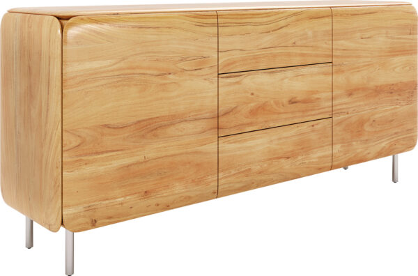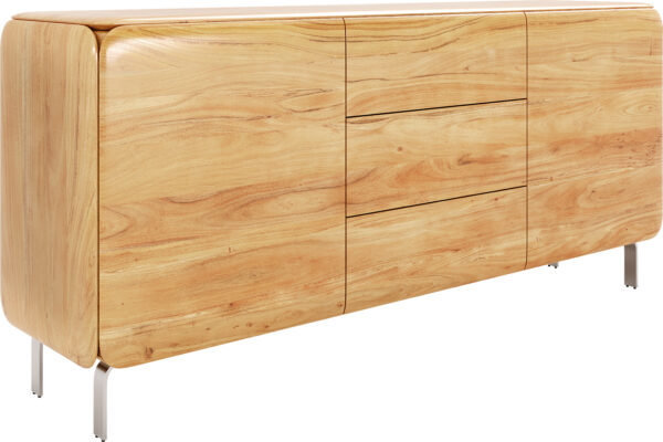 Komoda z akácie v barevném provedení přírodní je ideální volbou, pokud hledáte stylový úložný nábytek s jedinečným designem. Teplé, přírodní charisma akáciového dřeva skvěle ladí s moderními styly zařízení. Zvláště zaoblené hrany po celém obvodu, které jsou vyrobeny náročnou ruční prací, jsou skutečným poutačem a zdůrazňují vysokou řemeslnou hodnotu tohoto nábytku. Se dvěma dvířky a třemi zásuvkami navíc nabízí dostatek místa pro všechny vaše každodenní věci.
