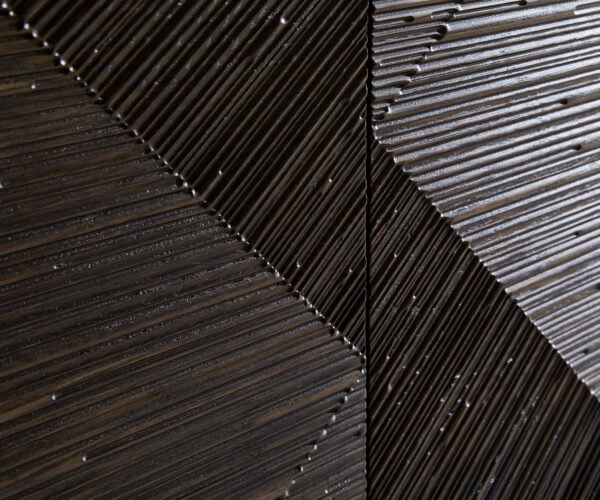 Komoda Tereos z ušlechtilé jasanové dřeviny v tmavě hnědé barvě vytváří se svými přímými 3D frézovanými detaily stylové akcenty. Čtyři dvířka nabízejí prostorný a pohodlný úložný prostor.