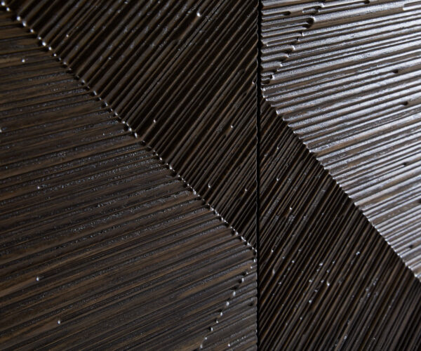 Komoda Tereos z tmavě hnědého jasanového dřeva zaujme svou jedinečnou povrchovou úpravou s přímým 3D frézováním. Čtyři dvířka nabízejí prostorný úložný prostor, snadné ovládání díky soft-close a push-to-open funkcím.