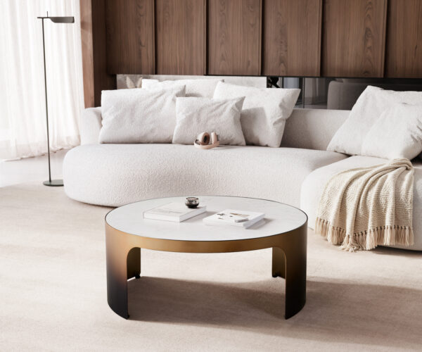 Konferenční stolek Alerio v bílo-zlaté barvě přináší do tvého domova zářivou eleganci. Bílá mramorová deska s jemnými žilkami dodává stolku nadčasový vzhled, zatímco kovová podnož se zlatým přechodem do černé – charakteristické ombré – vytváří fascinující hloubku. Nábytek, který dokonale spojuje světlo, lehkost a luxus.