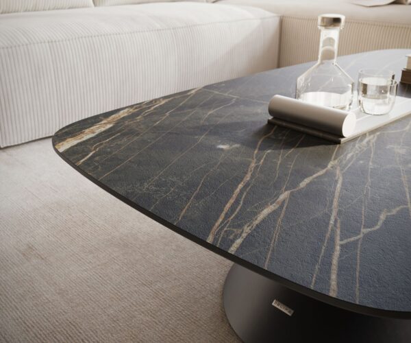 Konferenční stolek Edge v jeho výjimečném oválném tvaru byl vyroben z pravé italské keramické desky Laminam® v jedinečném hnědém odstínu Noir Desir a kromě svého úžasného vzhledu zaujme především svou odolností a každodenní praktičností. Deska stolku připomíná mohutný tmavý mramor, který je protkán vzorem ohromujících, křivolakých vln a s působivou intenzitou odráží všechny aspekty přírody – od silných a vášnivých až po jemné a něžné. Strukturální textura dodává materiálu ještě větší výraznost a spojuje čistý design se silou přírody.